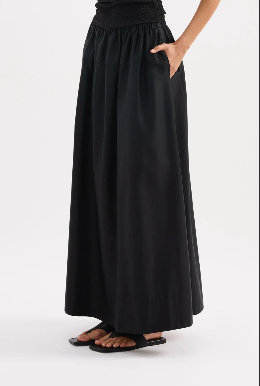 The Briony Maxi Skirt is made from a lustrous cotton poplin that has a smooth and elevated hand feel. The silhouette is feminine and relaxed with a fitted waist and a full gathered skirt. Features include a soft elastic waistband and side seam pockets. This skirt is fully lined.