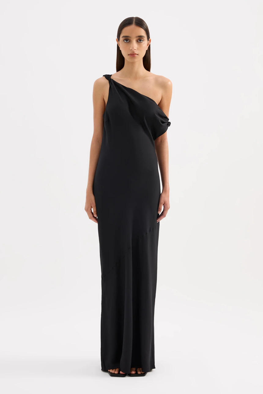 The Calista Tencel Dress is made from a Tencel blend fabrication which is lightweight and has a smooth, drapey hand feel. Cut on the bias, this silhouette drapes over the body softly and finishes at the ankles. Features include an asymmetrical, off the shoulder neckline with twist strap detail.
