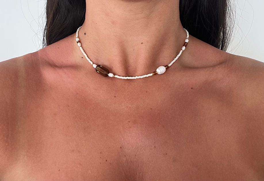 Beige seed beads, brown glass beads, freshwater pearls, and 24kt gold plated or stainless steel beads.