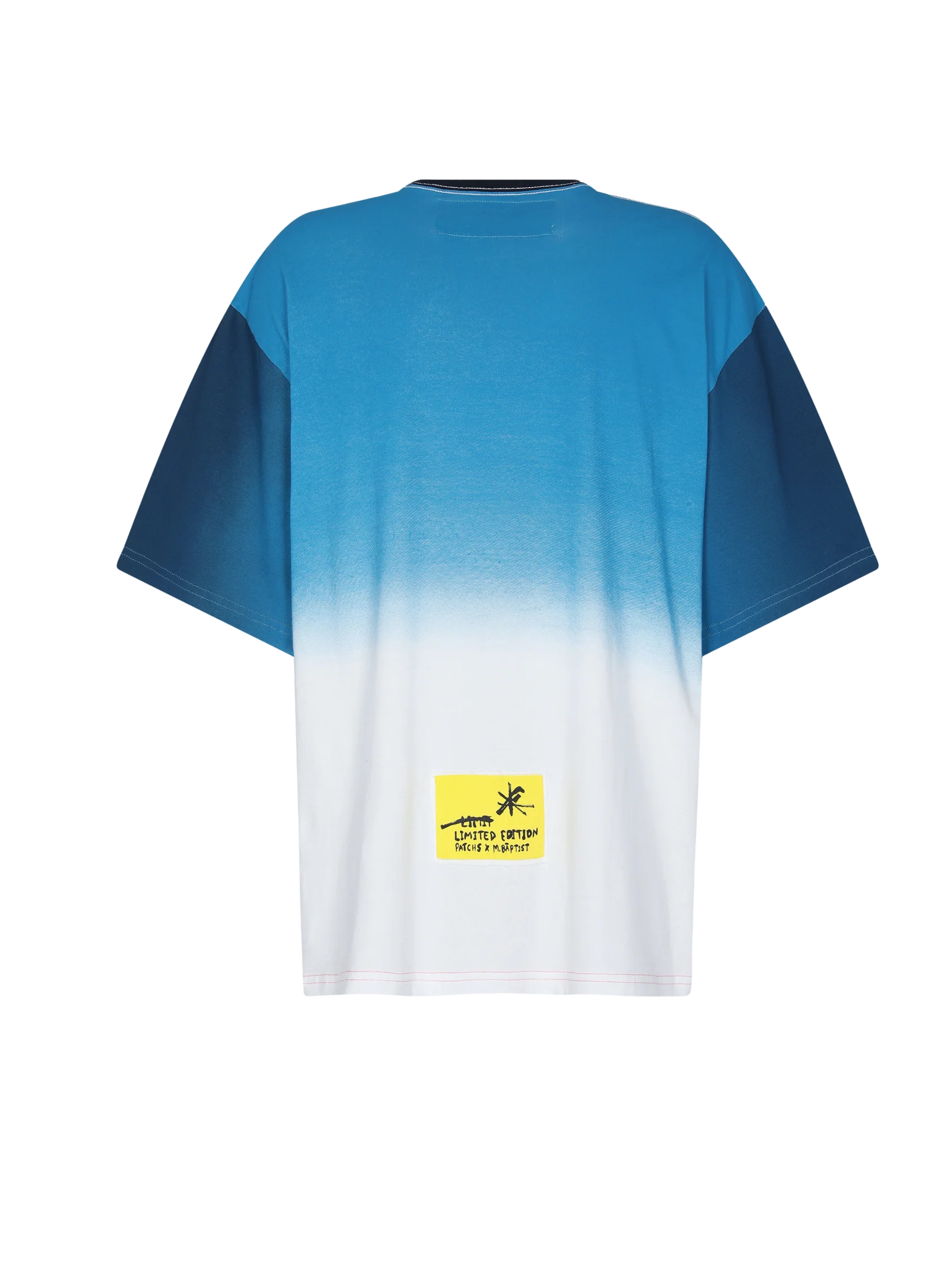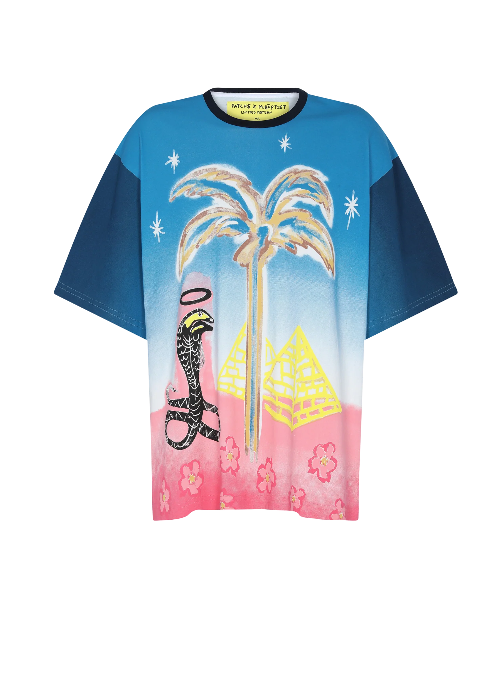 The Mirage Tee features bold, all-over prints by Marty Baptist on both front and back, hand crafted from soft, breathable Peruvian cotton. Ethically handmade in Peru, this relaxed-fit t-shirt blends vibrant colour and artistic expression with everyday comfort. A small yellow patch at the back adds a cool, understated detail.