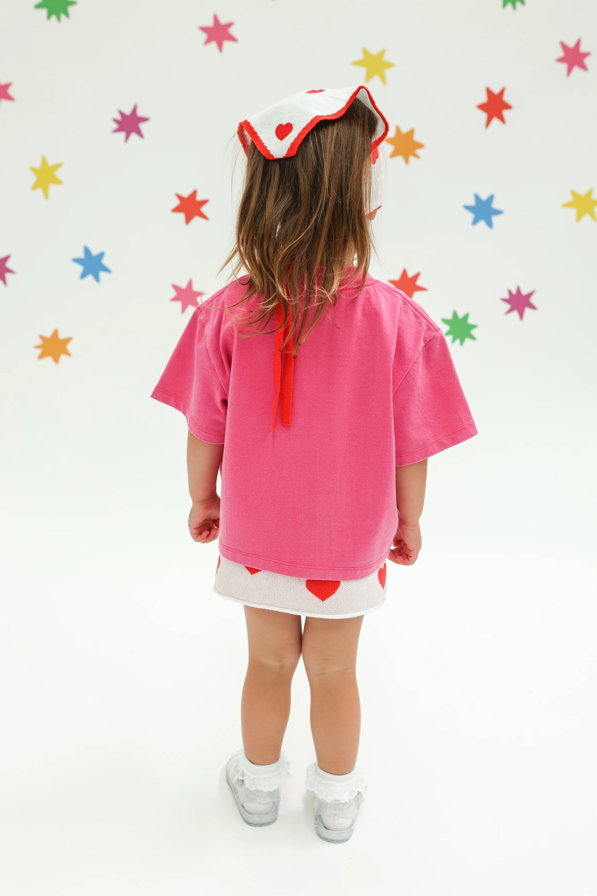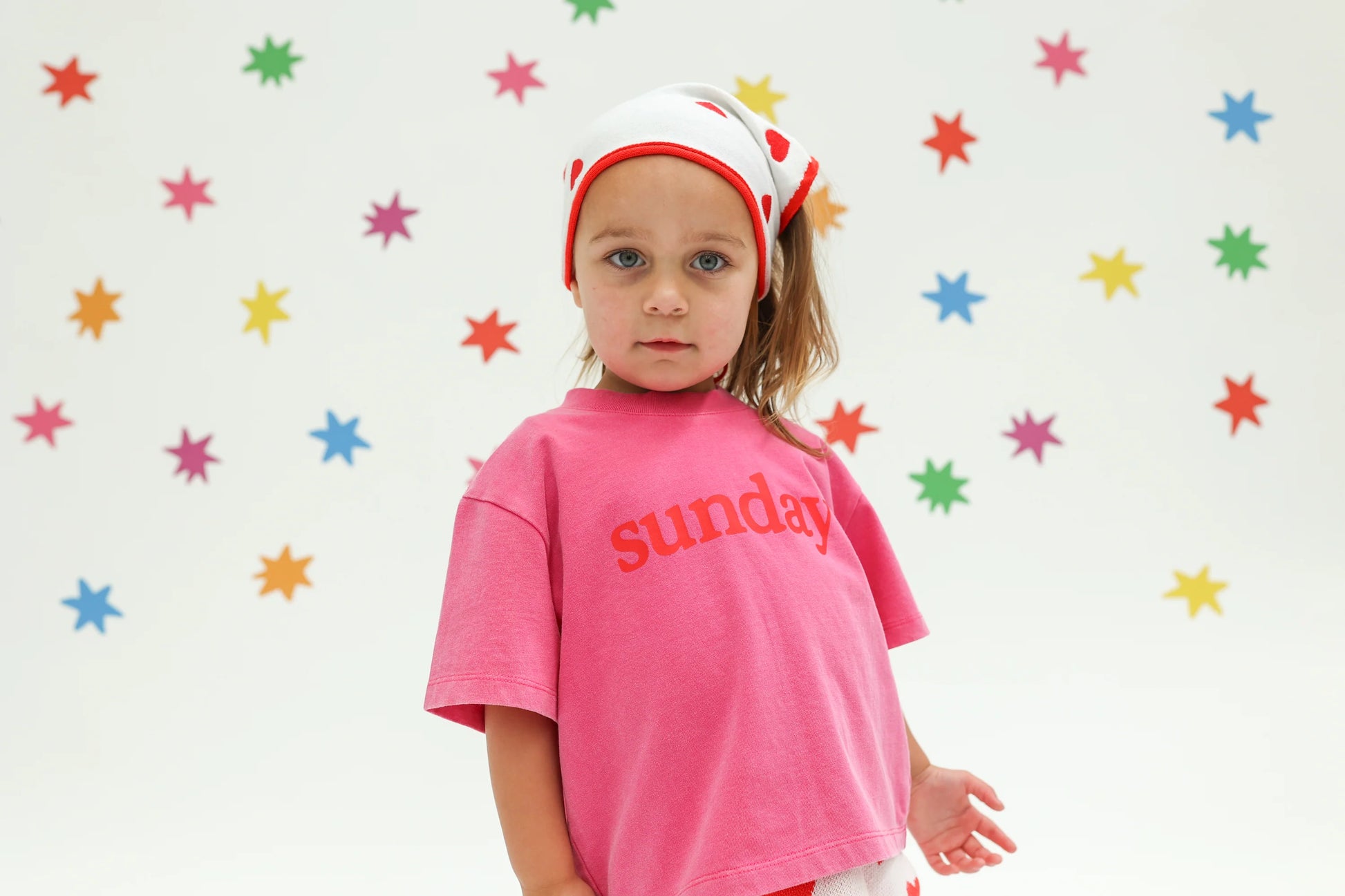 Our new acid wash 100% cotton tee in dark pink. A boxy, oversized fit, featuring a soft, worn-in feel from the first wear. Perfect for little adventurers with big imaginations.